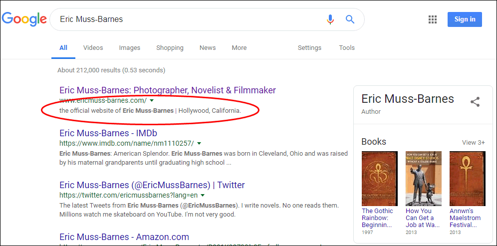 Like I said, there is a whole massive world to SEO. These lessons are incredibly basic and don't even begin to scratch the surface. But, if you want your websites to appear properly in searches, it's essential you understand the purpose and function of basic title tags and metatag descriptions. Below, you can see an example of the search results from my own personal webpage, where I have highlighted the description.