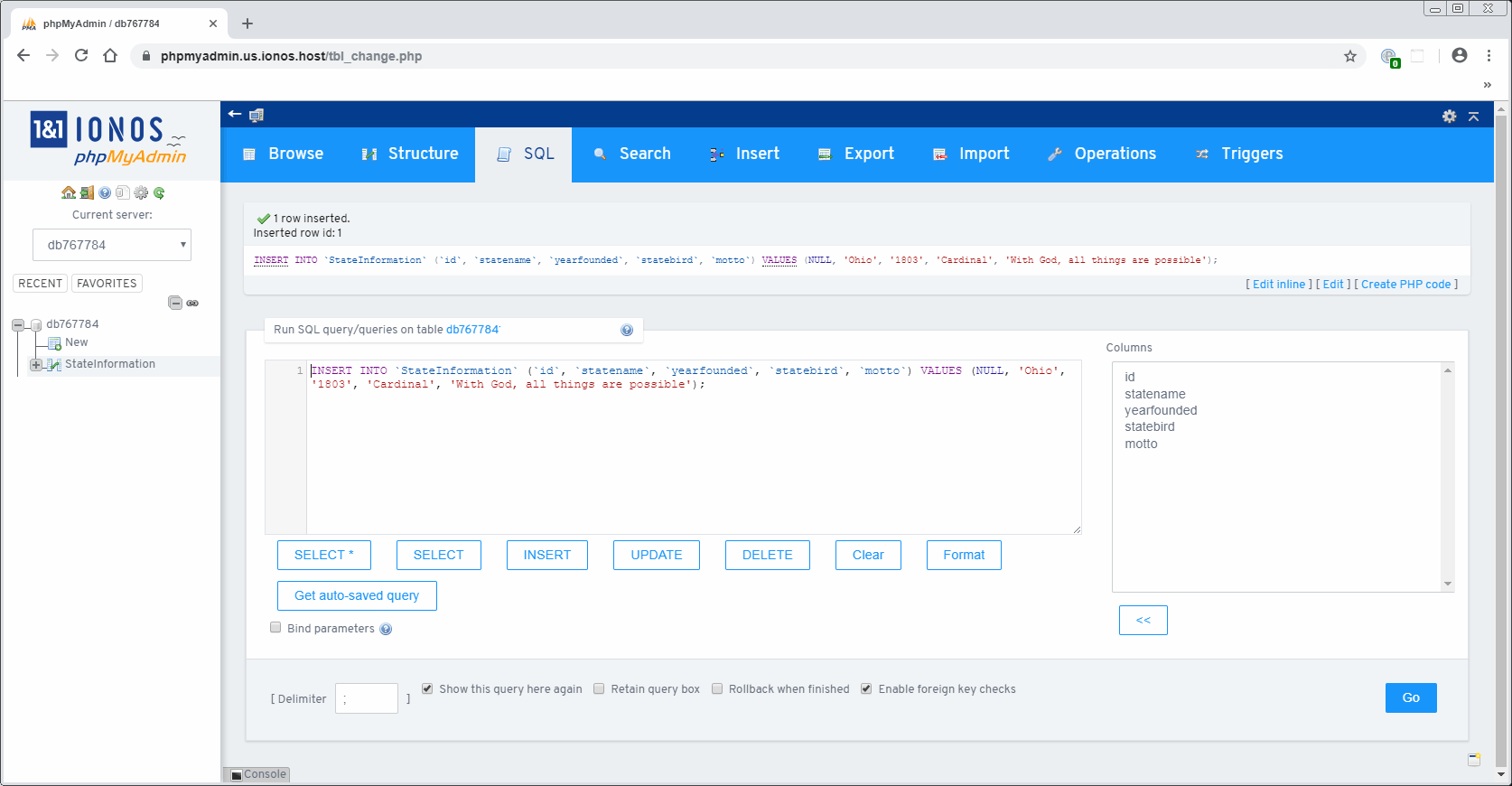 When hit the "Go" button, you will be shown the commands (called a "SQL query") which actually entered that information into the database, as shown below: